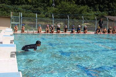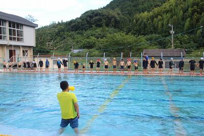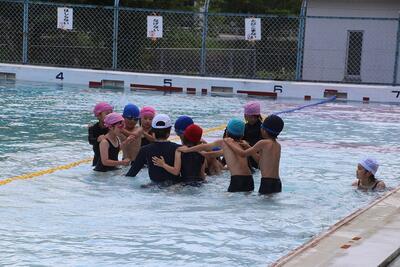 プール工事のため予定より11日遅れでプール開きを行いました。子どもたちはこの日を首を長くして待っていました。本校のプールには小プールがないため、3~6年生と1・2年生に分けて行いました。3~6年生では、初めの会を体育委員会の進行で行いました。地域の上村様に卒業アルバム用の写真撮影をしていただいて、活動を始めました。水慣れ・け伸びなどをして、水泳を得意とする子どもにお手本でいろいろな泳ぎを見せてもらいました。クロールや平泳ぎの練習を行いました。1・2年生では、初めてのシャワーに歓声を上げていました。水慣れをして、いろいろな動物になりきって歩いたり浮かんだり顔を付けたりしました。みんなでジャンケン列車して楽しみました。久しぶりに水の感触を楽しんだ東陽っ子です。