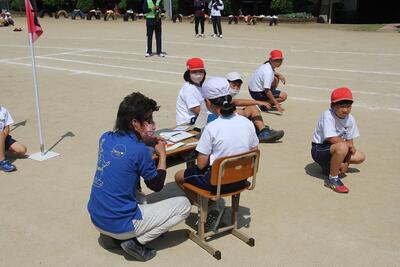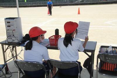 小中合同で運動会の予行練習を行い、開・閉開式や競技などを本番さながらに実施しました。予行練習でポイントとなる一つに運動会の係活動です。運動会の係には児童管理・招集・出発・決勝・準備・放送・記録の7つがあり、5・6年生全員が分担をして活動します。予行練習では、プログラム順に合わせた活動内容・分担などを確認しながら、担当の先生たちと連携して活動しました。運動会当日は係の仕事をがんばっている子どもたちにも注目していただければうれしいです。
