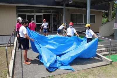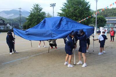 5月20日(土)に小中合同運動会を行いました。前日の雨の影響で準備があまりできなかったので、中学生が午前7時から準備をしてくれました。そのおかげで予定通りに午前8時20分から開始することができました。小学生は準備を行うことができなかったので、運動会後の後片付けをがんばりました。本部・来賓席で使用した机や椅子の足の部分をきれいに拭いて、体育館ステージ下倉庫に運びました。競技以外でもひたむきにがんばる東陽っ子です。