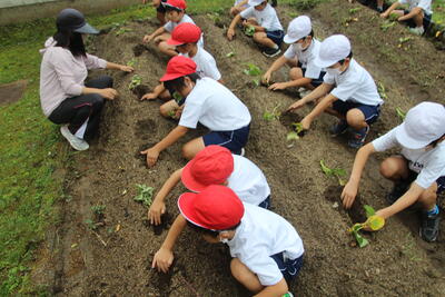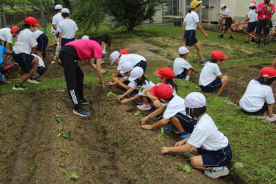 梅雨に入りました。雨が降らない時をねらって、全校で芋苗植えを行いました。昨年度は安納芋の苗を植えましたが、思うような収穫量が望めませんでした。そこで、今年度は紅あずまの苗を植えました。たくさん収穫できるようにみんなで育てていきます。