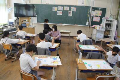 2年生も読書感想画祭です。祭については5年生の記事で説明しています。2つの本「かいじゅうのいるところ」「ミリーのすてきなぼうし」から1つ選んで、お話の場面をイメージして絵に表しています。子どもたちは一生懸命描いていました。教室には、描く音とクレパスの香りが広がっていました。