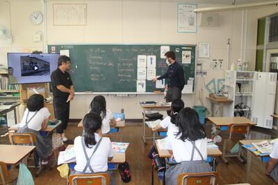 外国語科では、場所をたずねたり答えたりする学習をしています。この日は、ALTのJ先生の発音を聞きながらいろいろな場所の言葉を練習しました。次に、J先生に日本語では何というのかを質問しました。授業を通して、先生や子どもたちの語学力がアップしています。