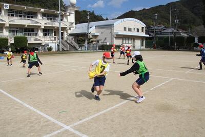 体育科では、ゴール型ゲーム「タグラグビー」の学習に入りました。この日は、パス練習やタスクゲーム「ボール運びゲーム」をして、ボール操作や攻守の動きなどを学習しました。次回からゲームをする予定です。