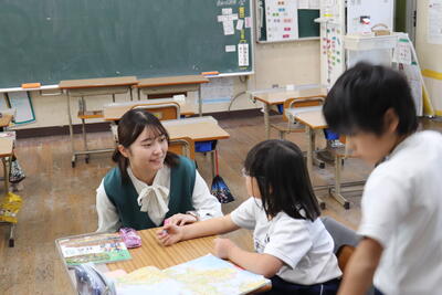 複式学級の支援のため、KLCこどもサポーター制度に申し込んだところ、東陽小学校に九州ルーテル学院に在籍され、将来教員を目指しているTさんに学習支援に来ていただくことになりました。