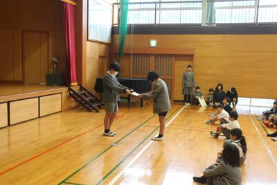 やまびこの集い(児童集会)を行いました。今回は、生活目標の振り返りと環境・図書委員会からの表彰などを行いました。運営委員会から先月と今月の生活目標についてのお知らせなどがありました。環境・図書委員会からは読書月間での取組の表彰を行いました。クラスで読書対決で1位だった5年生の代表に、また多読賞の児童に、その委員長から賞状が渡されました。感想発表では、外遊びも読書もがんばりたいという意見が出ました。各学年とも図書室の貸し出し数が大幅に伸び、読書月間での取組の成果がよく表れていました。