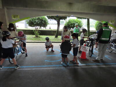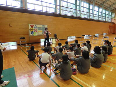 雨のため、体育館とピロティでの指導となりましたが、安全な歩行や自転車の乗り方について