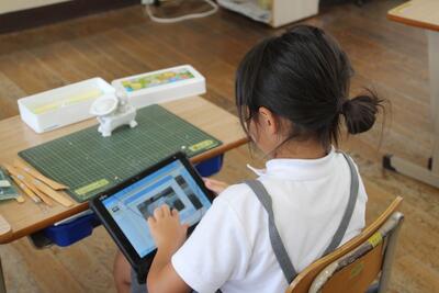 図工科では粘土を使って立体に表す学習を行いました。今回のポイントは、用具を使って切ったりかき出したりすることを行うことでした。自分が考えたことを粘土で表現しました。作品が完成すると、タブレットPCで撮影し、提出フォルダに入れていました。図工科でもICTが活躍しています。