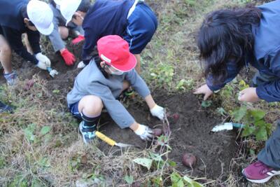 6月1日にいも苗を植えてから5ヶ月半が経ちました。この日、いもほりを行いました。栽培担当のT先生からやり方の説明を聞いて、活動を始めました。いものつるを取り除くのが難しかったようです。大きなものやニンニクの形をしたものが出てくると児童のテンションがさらに高くなりました。全部で約32㎏を収穫することができました。東陽町の恵みに感謝します。