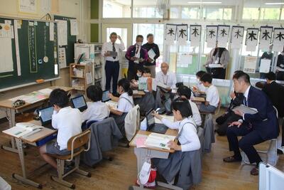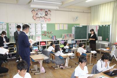 2・3年国語科の研究授業を行いました。2年生は「作り方の説明で自分が使いたい工夫をみつけよう」、3年生は「『中』の例示を筆者がこの順番にしたのは、どうしてだろう」というめあてで学習を進めました。本校の先生たちの他に、県義務教育課のH指導主事や東陽中学校の先生方など、たくさんの先生方に参観していただきました。いつもとは違う環境の中でも、児童はタブレットPCの学習シートのに自分の考えを書き込んだり、グループで話し合ったりしました。さらに、学習リーダーを中心にみんなで学習を進めました。児童が主体となって学習を進める姿を見ることができ、今後のめざす授業モデルとなりました。2・3年生の児童の皆さん、授業者のM先生、ありがとうございました。
