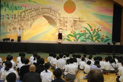 文化庁の舞台芸術等総合支援事業の学校巡回公演として神戸市の貞松・浜田バレエ団の皆様によるバレエ公演が東陽スポーツセンターで行われました。バレエを生で見る機会があまりないので、子どもたちはわくわくドキドキしていました。小学生が鑑賞しても飽きないように、いろいろな工夫がなされていました。前半は参加型のプログラム構成で、子どもたちにバレエの基本動作をしてもらったり、会場にいる人たちにも簡単な手の動きを行ってもらう取り組みがなされていました。また、前日のリハーサルから練習をしていた8人の子どもたちを「動物のカーニバル」にゾウ・イヌ・ネコ・ウサギで出演させていただきました。後半は、「白鳥の湖」や「日本バレエと祭」などのプログラムでバレエの美しさや楽しさ・力強さなど、見ている人を感動させるすばらしい公演でした。貴重な機会を与えてくださった、貞松・浜田バレエ団の皆様をはじめ関係者の皆様、ありがとうございました。