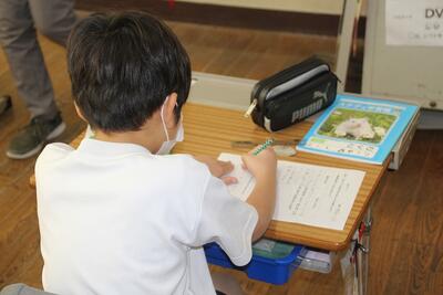 算数科では「三角形と四角形」という単元の学習が終わりました。ひとつの単元が終わると、だいたいテストが行われます。この日のテストでは、三角形や四角形のこと、辺や頂点、直角・正方形や長方形などの問いがありました。問題をよく読んで答えていました。