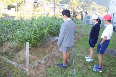 2学期の給食メニューに「ショウガごはん」があります。この日は、6年生が育てている畑から2株約3㎏の新ショウガをすこやか委員会の6年生が掘ってくれました。家庭でショウガ掘りを手伝っている人たちなので、手際よく数分で作業を終えてました。本校に隣接する東陽給食センターまで運びました。おいしいショウガごはんにしていただけるので、やりがいがあります。全部を収穫するのは、もう少し後になるようです。最近雨が降らないので、残っているショウガに水をかけました。