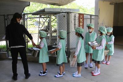 1年生は初めての学校給食でした。手を洗いエプロンを着て、校舎すぐ隣にある東陽給食センターに行きました。あいさつをして食器や食缶などを受け取り、教室まで運びました。教室ではおぼんや箸を配ったりご飯やおかずの配膳をしました。みんなで協力して準備ができました。1年生の初めての学校給食をお祝いして、そのメニューに赤飯が入っていました。1年生の笑顔があふれていました。
