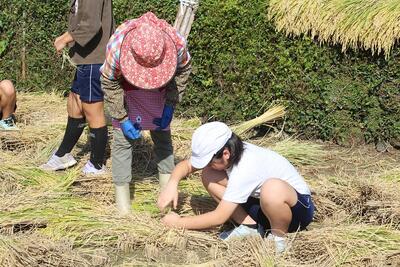 5・6年生が稲刈りを行いました。6月13日に田植えを行ってから約4ヶ月、黄金色に輝く稲穂(もち米)ができました。CS委員の橋本様ご夫妻に、稲の刈り方や束ね方・竿がけの仕方などを教えていただきました。初めて経験する5年生がいましたが、昨年度経験している6年生が一緒だったので、時間内に作業を終えることができました。収穫したもち米は、今後の給食メニューの食材に活用していきます。CS委員の橋本様ご夫妻、地域の関係者の皆様、ありがとうございました。