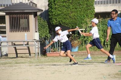朝の活動で、全員リレーを行いました。5月に行ったスポーツテストで児童の走力に若干の課題がありました。そこで、2学期から金曜日の朝の活動に全員リレーを取り入れ、児童の走力アップを図っていきます。この日は、第1回目の全員リレーでした。全校児童を赤白の2つのチームに分けて、一人運動場半周(約70m)を走りました。転んだりバトンを落としたり等のハプニングがありましたが、待っているチームメイトのために全力で走り切りました。リレーが大好きな東陽っ子です。