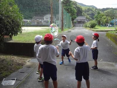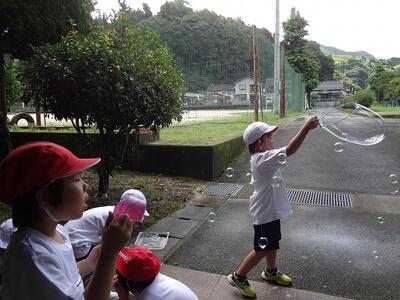 1年生は生活科で、様々な道具を使ってシャボン玉を作りました。