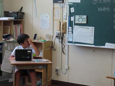 4年生は算数で、mとkmの関係、LとdLの関係を学んでいました。