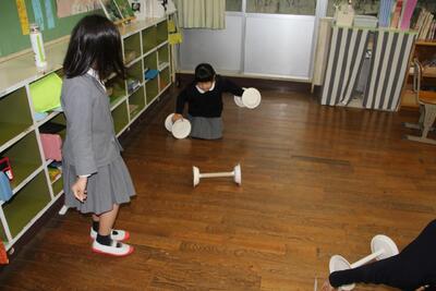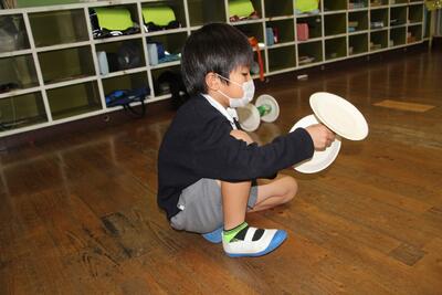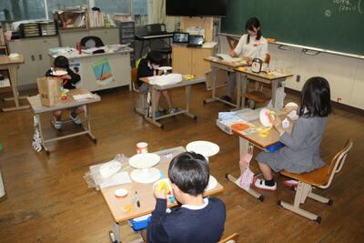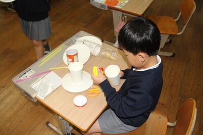 図工科では、紙皿を使った転がる仕組みから、楽しく転がるものを考え、いろいろな形や色・飾り方を工夫して表す学習を行いました。紙皿と、紙コップや紙の芯をボンドやテープで貼り付けて、転がる様子を楽しみました。「作って動かす」を繰り返しながら、創作活動を楽しんだ1年生です。