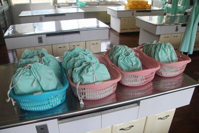 夏休み29日目になりました。2学期始業式までもうすぐです。2学期からの給食に備えて、事務室のT先生が給食エプロンの補修・洗濯・アイロンがけ等を行っていました。児童全員分の給食エプロンを一枚一枚丁寧に作業していました。2学期の給食も気持ちよく食べることができます。