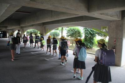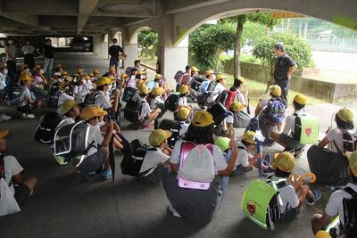 本校では、児童が安全に下校できるように一斉下校を適宜行っています。この日は先生たちの研修のために、給食後一斉下校を行いました。2学期から全員がたすきを着けるように呼びかけています。交通安全担当の先生からたすきの確認を行いました。生徒指導担当の先生からは下校後の過ごし方について話をしました。全職員で安心・安全な学校づくりを進めています。