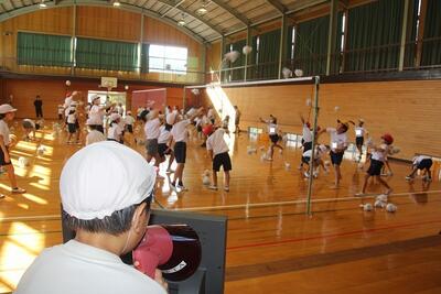 朝の活動では、ボール投げゲームを行いました。1学期行ったスポーツテストの結果の中で、本校児童の投げる力に課題があることが分かりました。その課題解決に向けて、体育主任のM先生が考案した楽しい運動です。新聞紙2枚を丸めてビニル袋に入れてボールを作ります。そのボールを2チームに分かれて陣地に投げ合い、陣地の中にボールが少なかったチームが勝ちというルールです。ボールの重さは約50gで、あまり転がらないので、安全にゲームができます。全校児童を仲良し班(縦割り班)6チームに分け、3コート同時にゲームを行いました。全校児童一斉に行い、白いボールが飛び交う様は壮観です。制限時間内に数え切れないくらい投げることができました。健やかな体の育成も本校の重要な教育活動の一つです。