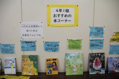 読書の秋です。本校の図書室には、児童が本に親しみやすい環境作りを行っています。新しい本の紹介はもちろん、季節にあった本・学習に役立つ本など、環境・図書委員会の児童や図書司書の先生が工夫しています。また、4年生が国語科の学習で行った「おすすめの本」を紹介するポップや帯が掲示されています。児童の読書活動を推進しています。