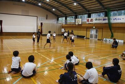 9月7日の続報です。毎週火曜日の朝の活動では、ボール投げゲームをしています。5月に行ったスポーツテストの結果から児童の投げる力に課題がありました。そこで、2学期から行っている活動です。この日から体育館にソフトバレー用のネットを設置して行いました。「高さをつける」場に変えることで、投げ方をオーバースローへと変化させるねらいがあります。返ってくるボールを何度も投げ合うので、投げる力が向上すると確信しています。体育委員会の児童が準備・運営をしてくれました。体育委員会の皆さん、ありがとうございました。