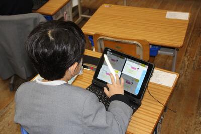 算数科では、小数のたし算やひき算について学習しています。「0.8-0.2」について、0.1がいくつ分あるのか整数に置き換えて考えました。タブレットPCに入力し、みんなの考えを共有して正解を探しました。情報共有アプリの使い方に慣れて、自分たちの力で進める3年生です。