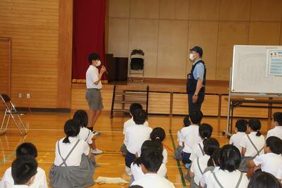 夏休みを前に不審者対応の避難訓練を行いました。教室に不審者が侵入したという想定で、職員の対応や児童の避難の仕方・職員室への伝達方法などの訓練を行いました。体育館に全員避難をした後に、東陽駐在所のI様からお話をしていただきました。「いかのおすし」を合い言葉に、具体的な行動について説明していただきました。児童からの質問にも丁寧に答えていただきました。児童代表のお礼の言葉では、今後の生活で気をつけたいことを伝えました。もしものために、防犯ブザーを持ち歩くことを徹底します。東陽駐在所のI様、ありがとうございました。