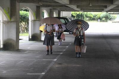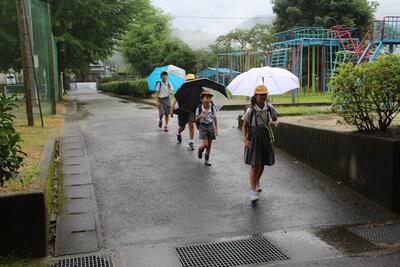 7月に入りました。梅雨本番の雨の登校の様子です。学校周辺から通ってくる児童は歩いて元気に登校しています。本校は校区が広く、遠いところから通ってくる児童は保護者の車やスクールバスでの登校となります。本校舎下にある半地下の駐車場が活躍します。ここでは徒歩での児童や送迎車の乗り降りをする児童が雨に濡れることがありません。半地下の駐車場から児童昇降口までが屋外になるので、そこでは傘が必要です。雨の日も元気に登校する東陽っ子です。