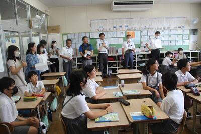 5・6年複式学級国語科の研究授業を行いました。八代市教育サポートセンターのN先生や東陽中学校の先生方に参加していただきました。この研究授業では、児童の主体的な学びとして学習リーダーの役割や、自分の考えを伝え合う活動の充実が研究の柱となっています。この授業を行うに当たって、5年生は現地見学、6年生は聞き取り調査等を事前に行っていましたので、子どもたちの学習意欲は高まっていました。学習リーダーが、活動時間を設定したり発言者を指名したりして、自分たちの力で授業を進めました。授業の終わりには,両学年から自分たちが学習したことを伝え合うことができました。たくさんの先生方に見られて緊張したと思いますが、5・6年生はがんばりました。八代市教育サポートセンターのN先生、東陽中学校の先生方、ありがとうございました。