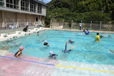 プール工事のため予定より11日遅れでプール開きを行いました。子どもたちはこの日を首を長くして待っていました。本校のプールには小プールがないため、3~6年生と1・2年生に分けて行いました。3~6年生では、初めの会を体育委員会の進行で行いました。地域の上村様に卒業アルバム用の写真撮影をしていただいて、活動を始めました。水慣れ・け伸びなどをして、水泳を得意とする子どもにお手本でいろいろな泳ぎを見せてもらいました。クロールや平泳ぎの練習を行いました。1・2年生では、初めてのシャワーに歓声を上げていました。水慣れをして、いろいろな動物になりきって歩いたり浮かんだり顔を付けたりしました。みんなでジャンケン列車して楽しみました。久しぶりに水の感触を楽しんだ東陽っ子です。