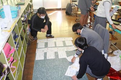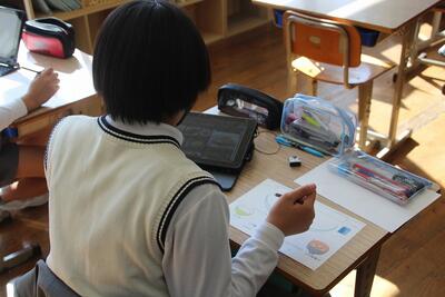 学校給食記念週間の作品作りを行いました。6年生が好きな給食メニューや標語をかいていました。給食メニューのイラストを描く際には、タブレットPCを活用していました。この作品は商業施設や公共施設にて展示されます。ぜひご覧ください。