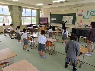 1年生は音楽の授業で校歌を練習しました。5月の運動会では大きな声で歌ってくれるでしょう。