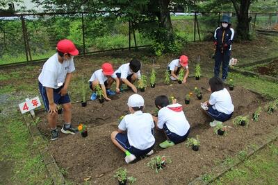 全校で学級園の整備を行いました。雑草を取り除き、腐葉土を入れてうねを作りました。ポーチュラカやマリーゴールドなどの花の苗を植えたり、ナスやキュウリ・ピーマンなどの夏野菜の苗を植えました。夏野菜が実ったら、給食の食材として利用する予定です。みんなで大切に育てていきます。