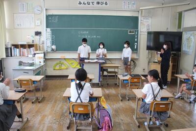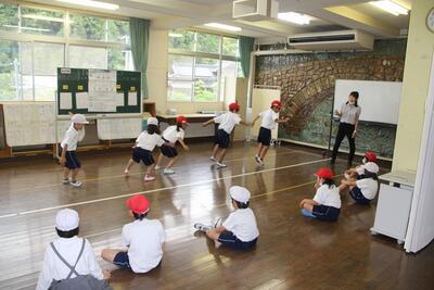 朝の活動ではスポーツテストの練習を始めました。この日は、1・2年生は反復横跳び、3・4年生は20mシャトルラン、5・6年生は上体起こしの練習をしました。1年生は初めての反復横跳びだったので、やり方や数え方の説明を受けてから行いました。練習ですが、どの学年も一生懸命取り組んでいました。