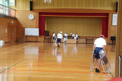 5月20日(土)に小中合同運動会を行いました。前日の雨の影響で準備があまりできなかったので、中学生が午前7時から準備をしてくれました。そのおかげで予定通りに午前8時20分から開始することができました。小学生は準備を行うことができなかったので、運動会後の後片付けをがんばりました。本部・来賓席で使用した机や椅子の足の部分をきれいに拭いて、体育館ステージ下倉庫に運びました。競技以外でもひたむきにがんばる東陽っ子です。