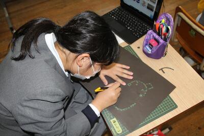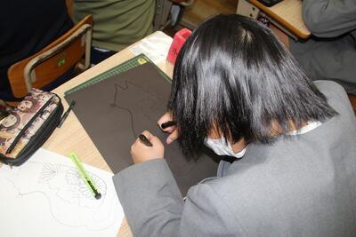 図工科では、東陽中学校のH先生と一緒に切り絵の学習を行っています。表したい絵をイメージして、黒画用紙に写していきます。絵が細かすぎると切る作業が難しくなるので、工夫が必要です。写し取った黒画用紙をアートナイフで切り取っていきます。紙を回しながら一つ一つ丁寧に切っています。切り取ったスペースには作品に合う色紙を貼って行きます。どんな作品ができあがるのでしょうか。
