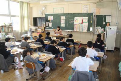 給食週間にあわせて学級活動では、給食のよさについて学習しました。給食のよさで一番目に考えられるのは、栄養のバランスです。赤・黄・緑の食品群をもとに、食材の栄養について考えました。給食の時間には、食育ボードを掲示して栄養のことを考え、給食をおいしくいただきました。