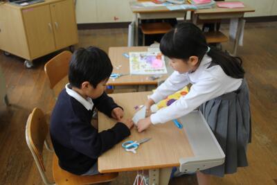生活科では、新1年生の体験入学をひかえたこの日に、プレゼントづくりを行いました。生活科の学習で育てたアサガオの種を新1年生にプレゼントします。折り紙でアサガオを折ったり、プレゼントイレの袋を作ったりしました。新1年生が喜んでくれるとうれしいです。