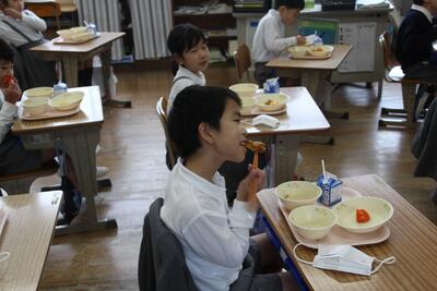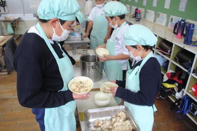 今月のふるさとくまさんデーの給食メニューは「かねあげ」「五目おこわ」でした。「かねあげ」はサツマイモの天ぷらのことで、天草地方の郷土料理です。その中には6年生が収穫したショウガが入っています。「五目おこわ」のもち米は5年生が田植え・稲刈りをして収穫したものです。どちらもとてもおいしかったです。5・6年生と、ショウガやもち米の収穫をサポートしていただいたCS委員の橋本さん、ありがとうございました。