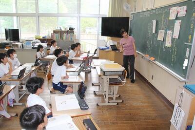 算数科では、一億までの数の仕組み・よみ方・かき方を理解し、十進位取り記数法のよさについて学習しています。この日は、都道府県の人口を比べていました。自分の考えをタブレットPCに入力し、その画面を見せながらグループで話し合いました。タブレットPCでは、拡大や縮小が簡単にできるので、説明を聞く側は分かりやすいです。