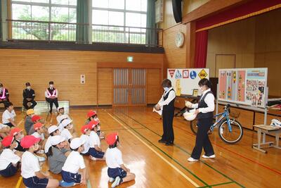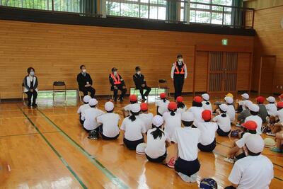 交通安全協会・東陽駐在所・八代市役所・東陽交通指導員などの方に来ていただき、交通教室を行いました。安全な歩行や自転車の乗り方について丁寧に説明していただきました。段ボールを使った内輪差での巻き込みや衝突の実演、豆腐を使ったヘルメットの有効性の実演など、より安全を意識するための工夫がたくさんありました。教えていただいたことを毎日実践していきます。交通安全協会をはじめ関係者の皆さん、ありがとうございました。