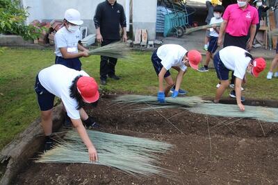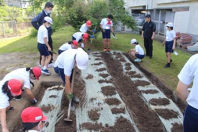 東陽町の特産品であるショウガの植え付け体験を5・6年生が行いました。CS委員の橋本さんに教えていただきながら作業を進めました。まず、しょうがを植えるときよい置き方があり、それを見分けるのが子どもたちにとって難しかったようです。穴の中にたねショウガを置き、土をのせていきました。そして、保湿効果と雑草が生えないようにい草をのせていきました。さらに、風等で飛ばないようにくわや移植ごてを使ってその上に土をのせていきました。家でショウガ植えの手伝いをしている人がいて、くわの使い方がとても上手でした。今回2つの品種(八郎・新高地)を植えました。大きさや形が異なっていて、驚きました。CS委員の橋本さんから子どもたちと職員にショウガのプレゼントがありました。ショウガのステキな香りに包まれて、東陽町の素晴らしさを実感しました。CS委員の橋本さん、ありがとうございました。