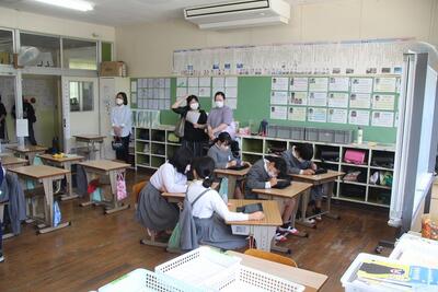 東陽中学校の先生方が本校の5・6年生と一緒に学習してくださる「乗り入れ授業」がスタートしました。今年度5・6年生が複式学級となり、そのサポートのために8人(8教科)の先生方に参加していただいています。小・中学校に兄弟姉妹関係の児童生徒が多いので、中学校の先生方を身近な存在に感じている児童がたくさんいます。中学校の先生方、よろしくお願いします。