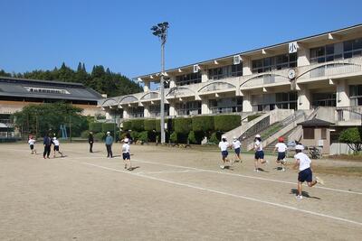 本校では、朝の活動として全校児童で週3回ランニングを行っています。まず、運動場に全員集まりラジオ体操を行います。その後、健康観察をしてから、走ります。1~4年生は5分間、5・6年生は10分間走ります。これを1年間続けることで、児童の体力向上につながります。また、健康づくりにも効果があるので、先生たちも走っています。みんなで活動するから続けることができます。