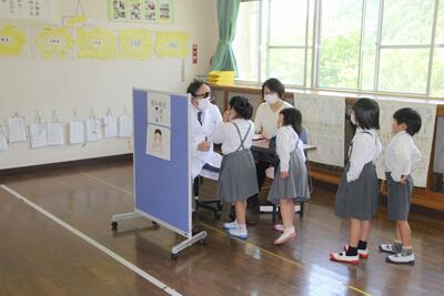 新年度になり健康診断がスタートしました。この日は歯科検診でした。給食後にいつもより丁寧に歯を磨いた子どもたちでした。歯科医のF先生の前で口を大きく開けて、みてもらいました。検診後に学校から結果を渡します。異常が合った場合は、保護者の皆さん、子どもたちの病院受診をお願いします。