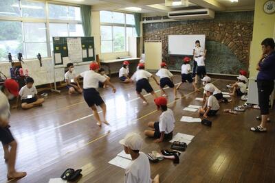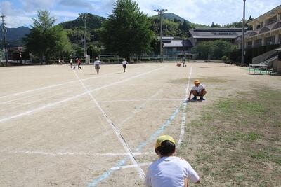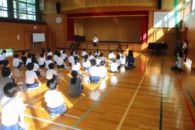 朝の活動ではスポーツテストの練習を始めました。この日は、1・2年生は反復横跳び、3・4年生は20mシャトルラン、5・6年生は上体起こしの練習をしました。1年生は初めての反復横跳びだったので、やり方や数え方の説明を受けてから行いました。練習ですが、どの学年も一生懸命取り組んでいました。