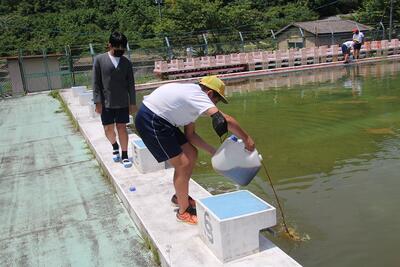 6月6日にプール掃除を行う予定です。その前にEM菌を5・6年生がプールに入れました。EM(通称:EM菌)はEffective(有用な)Microorganisms(微生物たち)の英文の頭文字に由来しています。その名の通り、特殊なひとつの菌ではなく、乳酸菌や酵母、光合成細菌など、どこにでもいる微生物で、人間にとっていい働きをしてくれる微生物の集まりです。EM菌という菌は存在せず、EM中の微生物の集合体の総称として広く使われています。これをプールに入れると、汚泥の臭いやぬめりなどをおさえたり、汚れが落ちやすくなったりします。薬品ではないので、河川や海などの環境汚染や、健康被害はありません。EM菌は環境に優しい便利なものです。
