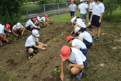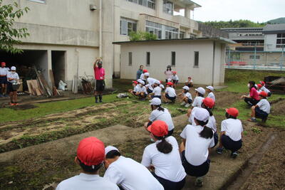 梅雨に入りました。雨が降らない時をねらって、全校で芋苗植えを行いました。昨年度は安納芋の苗を植えましたが、思うような収穫量が望めませんでした。そこで、今年度は紅あずまの苗を植えました。たくさん収穫できるようにみんなで育てていきます。